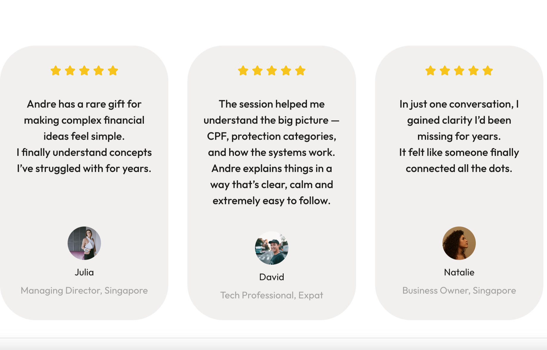 A free 1-on-1 session for expats, PRs, and business owners in Singapore who want answers about insurance, healthcare, CPF, SRS, and investments — without jargon or confusion. Expert guidance. Real clarity. No product push. Stop guessing, start learning — your financial clarity begins here!